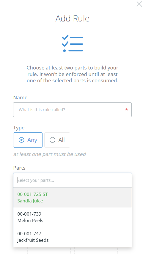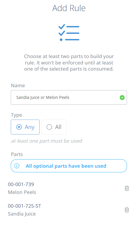 This gives you the flexibility to define whether parts are optional or required, and to set up conditions where ANY or ALL of the selected parts must be used.