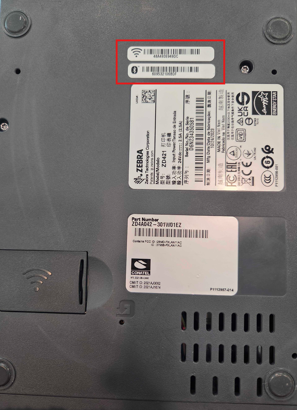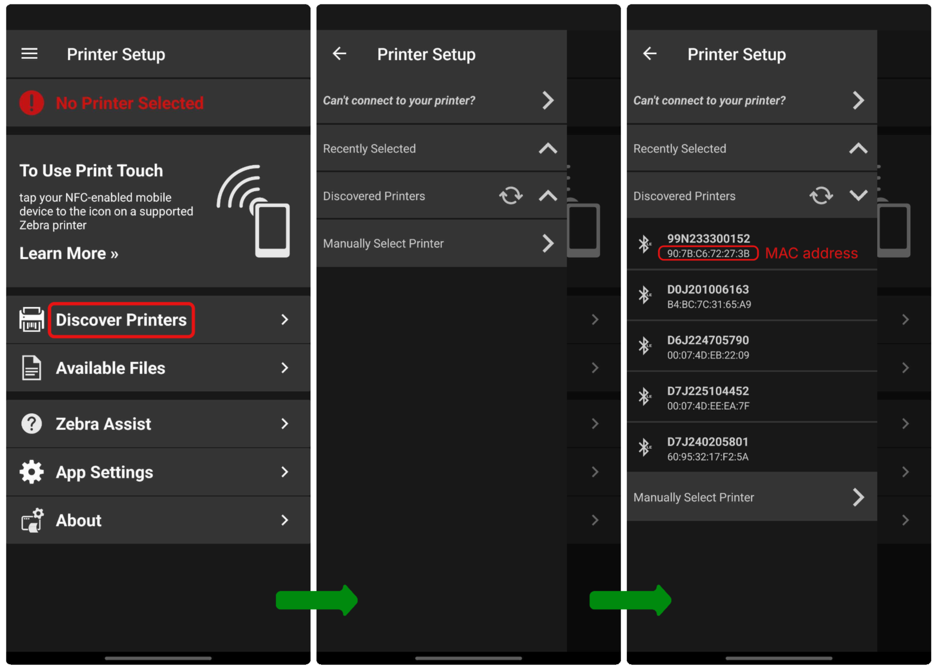 In the Zebra Printer Setup app, tap "Discover Printers" and an aside will open with a Discover Printers tab. If the arrows are spinning, the printer discovery process is started, and nearby printers that are connected to power will begin to show. Printers will be listed by Bluetooth address and MAC address, both of which can be found on the printer.