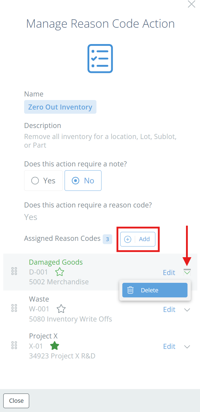 On the Reason Code Actions page, click 'Edit' in the Actions column to open the aside. Here, you can control if a note is required to be entered when this Reason Code Action is used, as well as which Reason Codes can be selected during the transaction. Click 'Add' to add additional Codes, or click the dropdown arrow next to a Code and select 'Delete' to remove it from the list. The default Reason Code for the Action will be marked with a green star icon; click on the star icon to toggle the default on/off.