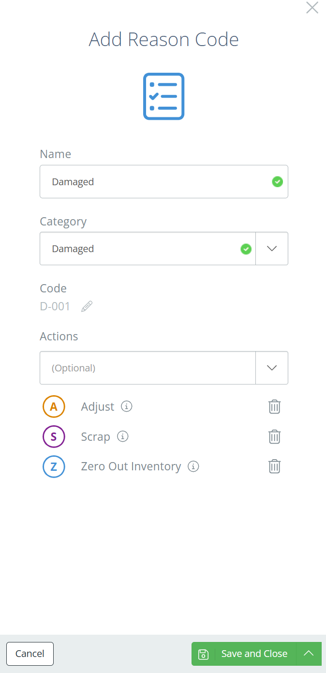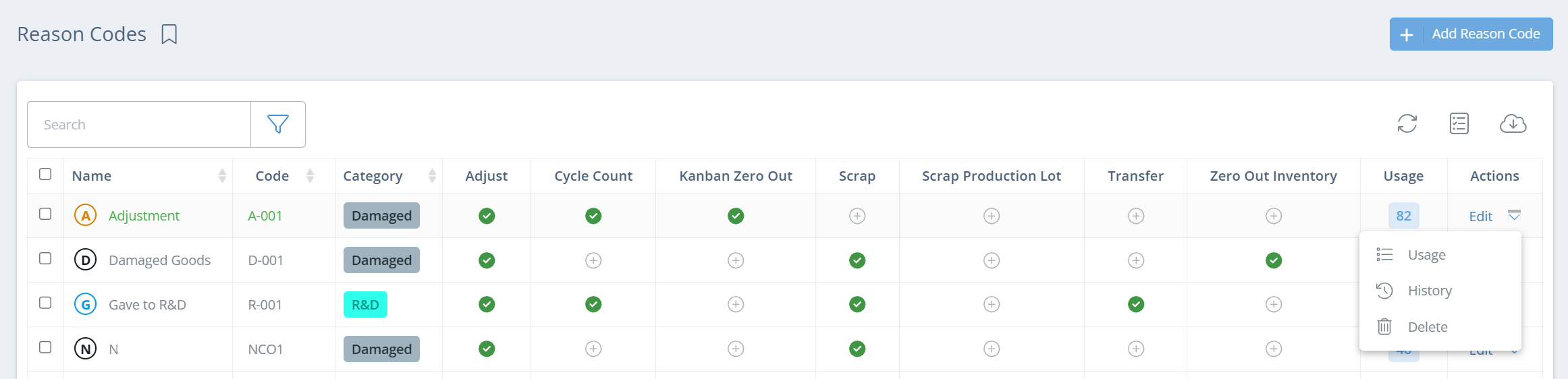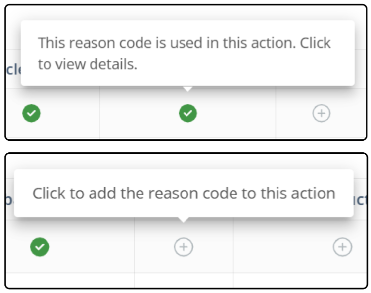 Once the Reason Code(s) are set up, you can edit the Actions that each Code is used on by clicking on the '+' button in the corresponding column, or the green check mark if the Code is already active.