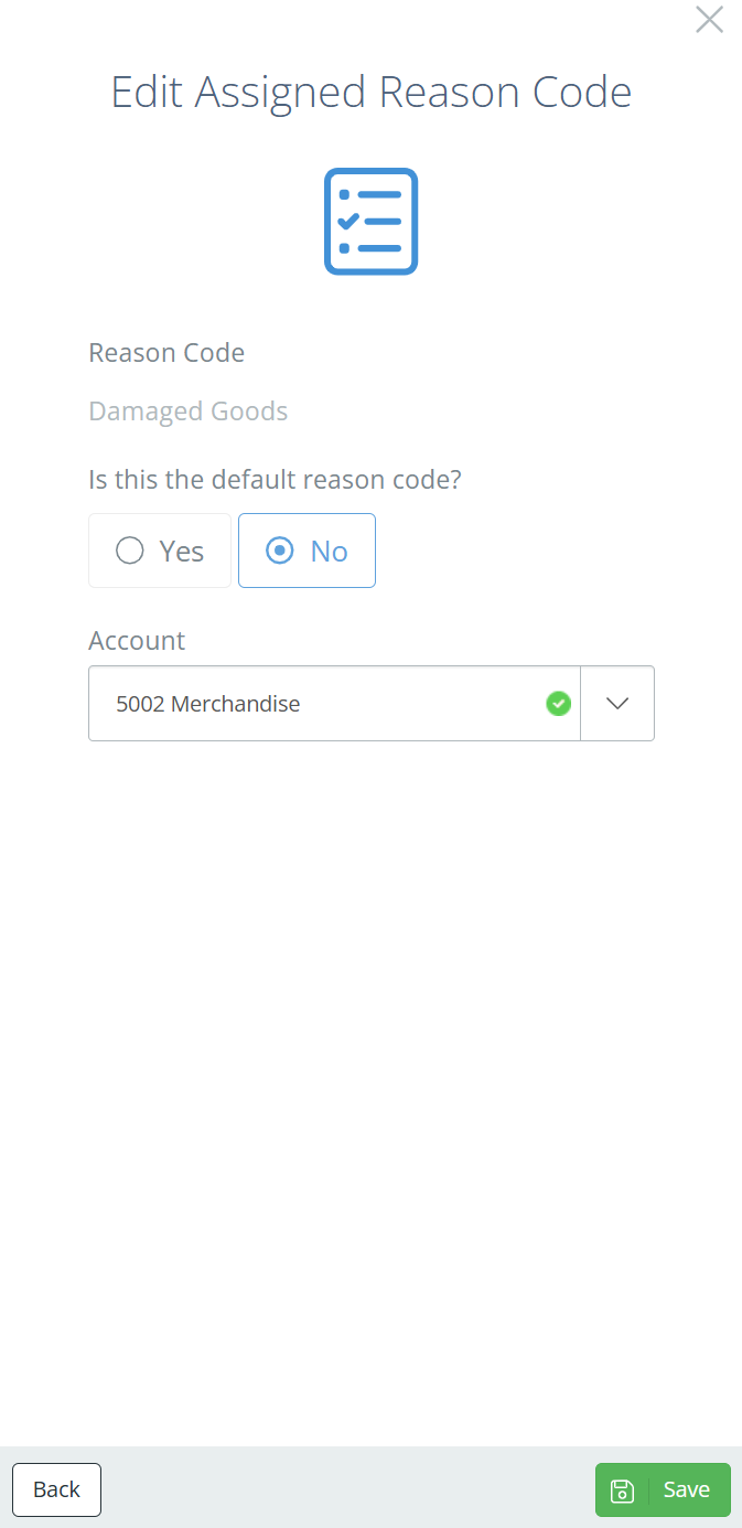 Find the Reason Code you want to make changes to, then click "Edit". In the new Reason Code aside, you can again choose if the Code should be the default for the Reason Code Action, but you can also select a financial account to associate with Reason Code. Any account within your Chart of Accounts should be available for selection.