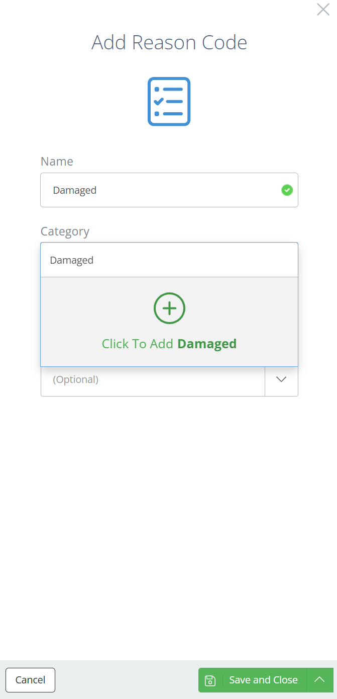 In the new aside, enter a name for the Reason Code, and select a category. If there are no categories, or you want to create a new one, just type the name of the category and click in the dropdown to create it.