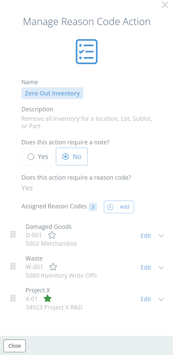 Reason Codes are individual on each DataNinja site, and can be applied to any and/or all of the Reason Code Actions. Reason Codes are way to categorize certain inventory transactions within DataNinja and tie them to specific financial accounts for improved tracking of inventory costs.