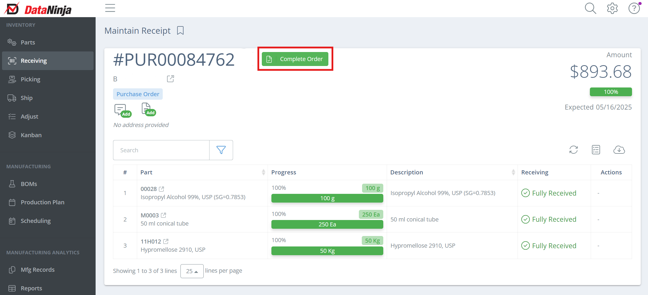 To use this feature, follow the steps above until all received inventory on this PO has been received in DataNinja. A Receipt is automatically created when the PO is first received against, and each lot will show on it's own line: