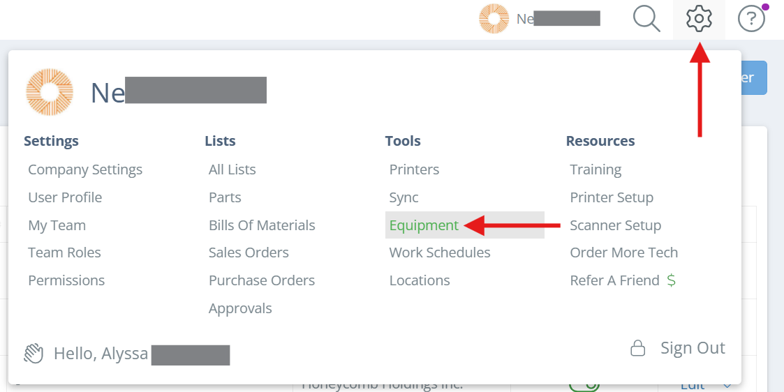 Click on the settings icon in the upper right corner and click on "Equipment".