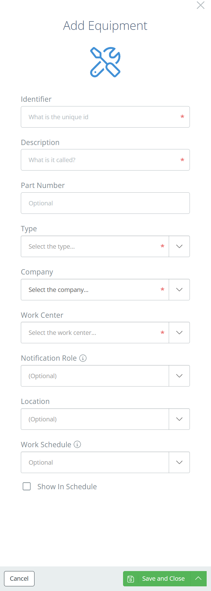 The optional fields are helpful for better tracking, and you can set up email reminders to be sent to a role when a scale (or other equipment) is due for service. Click 'Save and Close' when finished.