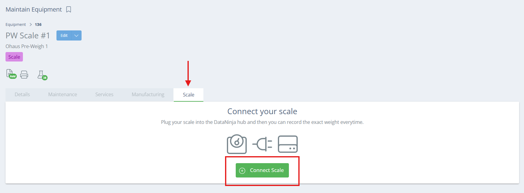 To set up a scale for use in DataNinja, it will need to be added to the equipment page, plugged in, and then connected in the UI.