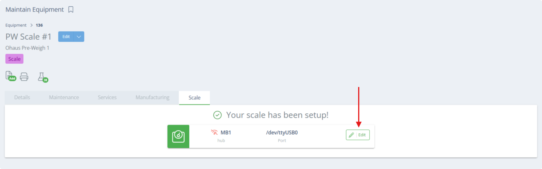 On the Maintain Equipment page for the scale, go to the scale tab, and click "Connect Scale".