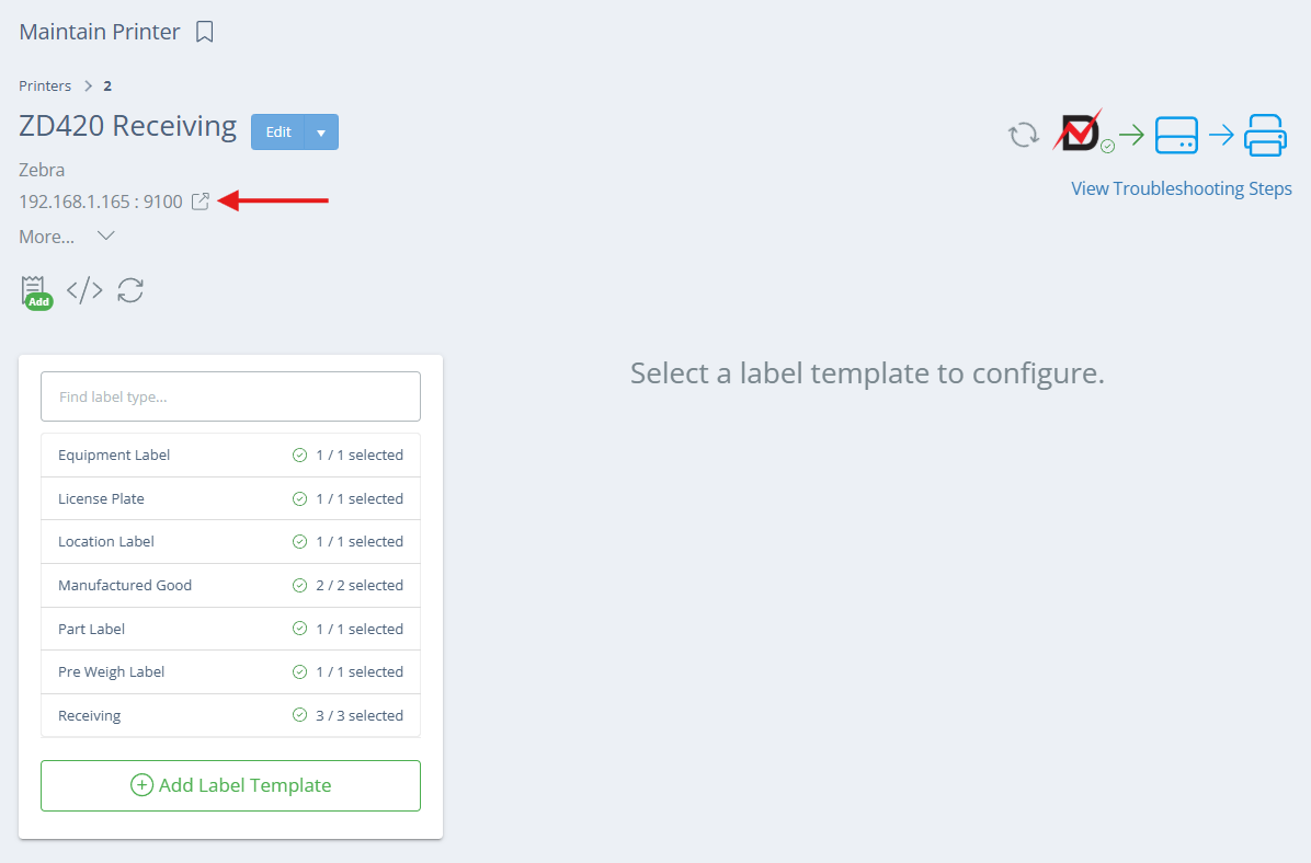 If you see a printer status of "Ready", your printer is connected to your network and DataNinja has the correct information. If you see a red error message in place of the "Ready" pictured above, it usually means the printer is not closed properly or is out of label stock/ribbon.